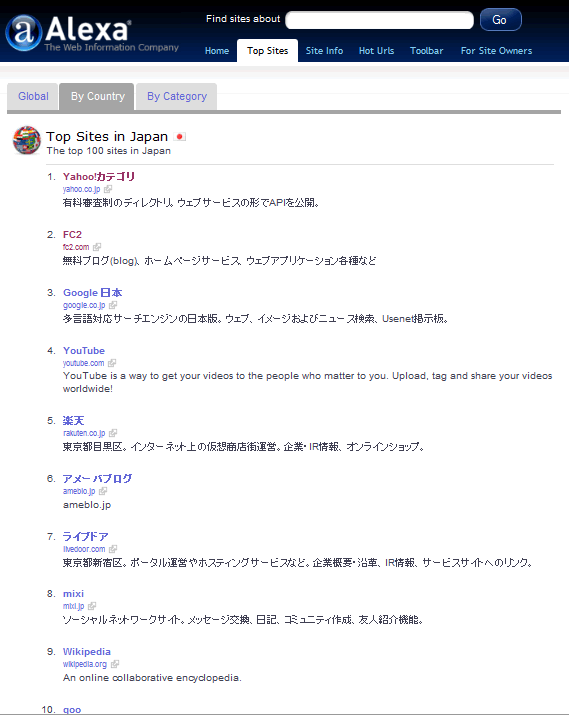 ということで、早速このサイトにでていた日本アクセスランキングトップ20を公開ですー
