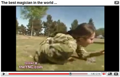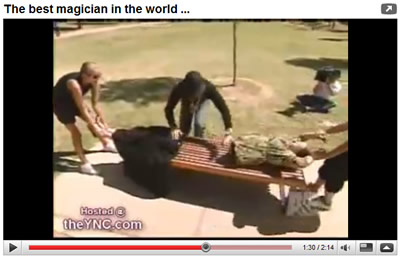 屋外で自分の体を上下二つに切っちゃって、両手だけで上半身をささえながら歩いてました。彼のマジックを見ていた観客が悲鳴をあげて後ずさりするという効果付き。
