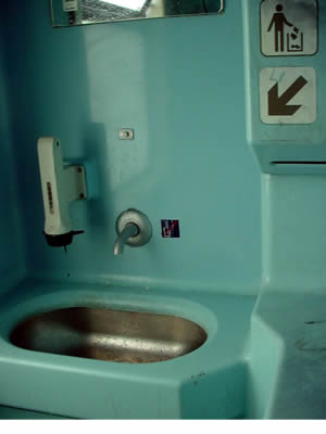 これはDoppeldecker (二階建電車)の中。トイレは昔ぽっとん式だったけど、今はほんのわずかになりました。上はトイレの中です。クリックすると大きくなります。 |