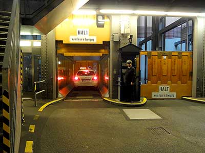 トンネルまでは車も通行人も、垂直のエレベーターで下に降ります。