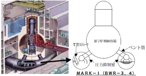 2)サプレッションプールは,原発のどこかで配管が破断し,そこから冷却水が失われる「冷却水喪失事故」という重大事故が発生し,原子炉周辺が高温高圧の蒸気 に満ちたときに,圧力で格納容器が損傷するのを防ぐために,蒸気をプールに導き,水に凝縮させて圧力を下げるはたらきをします。炉心周辺の蒸気をプールに 導くための配管を「ベント管」といいます。