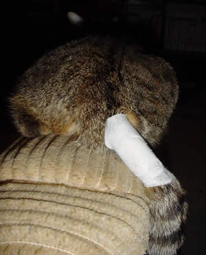 病院で塗り薬をもらい、その上に幅広包帯絆創膏をくるくる巻きつけてもらってます。傷口の4倍の長さで巻いてあるのは、猫がその部分を舐めて取ろうとするからのようです。