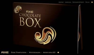 AXEは男性化粧品のブランドで、デオドラント、アフターシェイブ、シャワージェルなどが販売されています。誕生日のプレゼントにも大活躍するAXEに新しい香りの「Dark Templation」が加わったために大キャンペーンが繰り広げられたのですが、そのメインになったのがこのチョコレート。