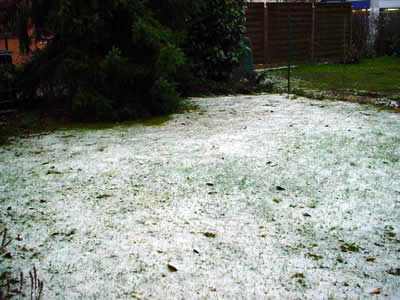 夜中だったので、写真は断念。朝になってから雪を探したけど、みぞれみたいだったからもうだいぶ溶けちゃってました。が、お隣の庭はまだだいぶ残ってます。早速証拠写真をパチリ。